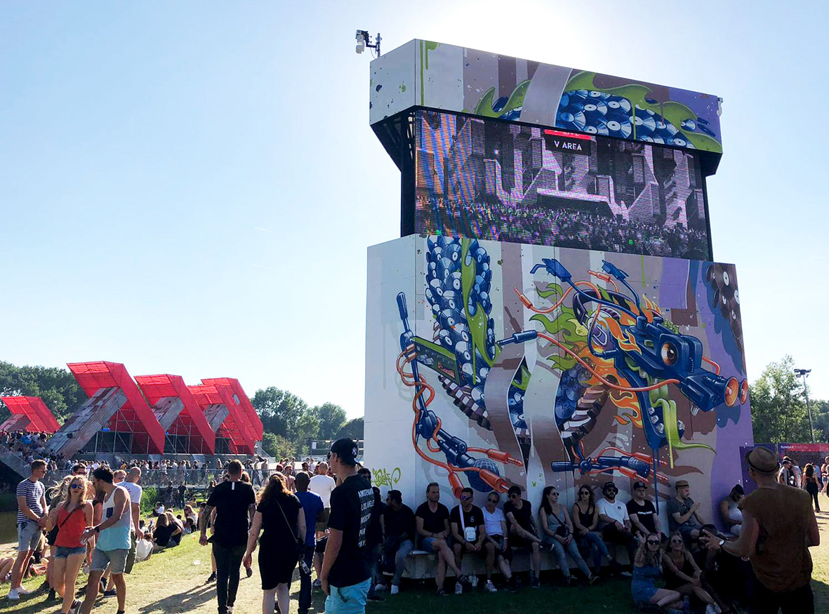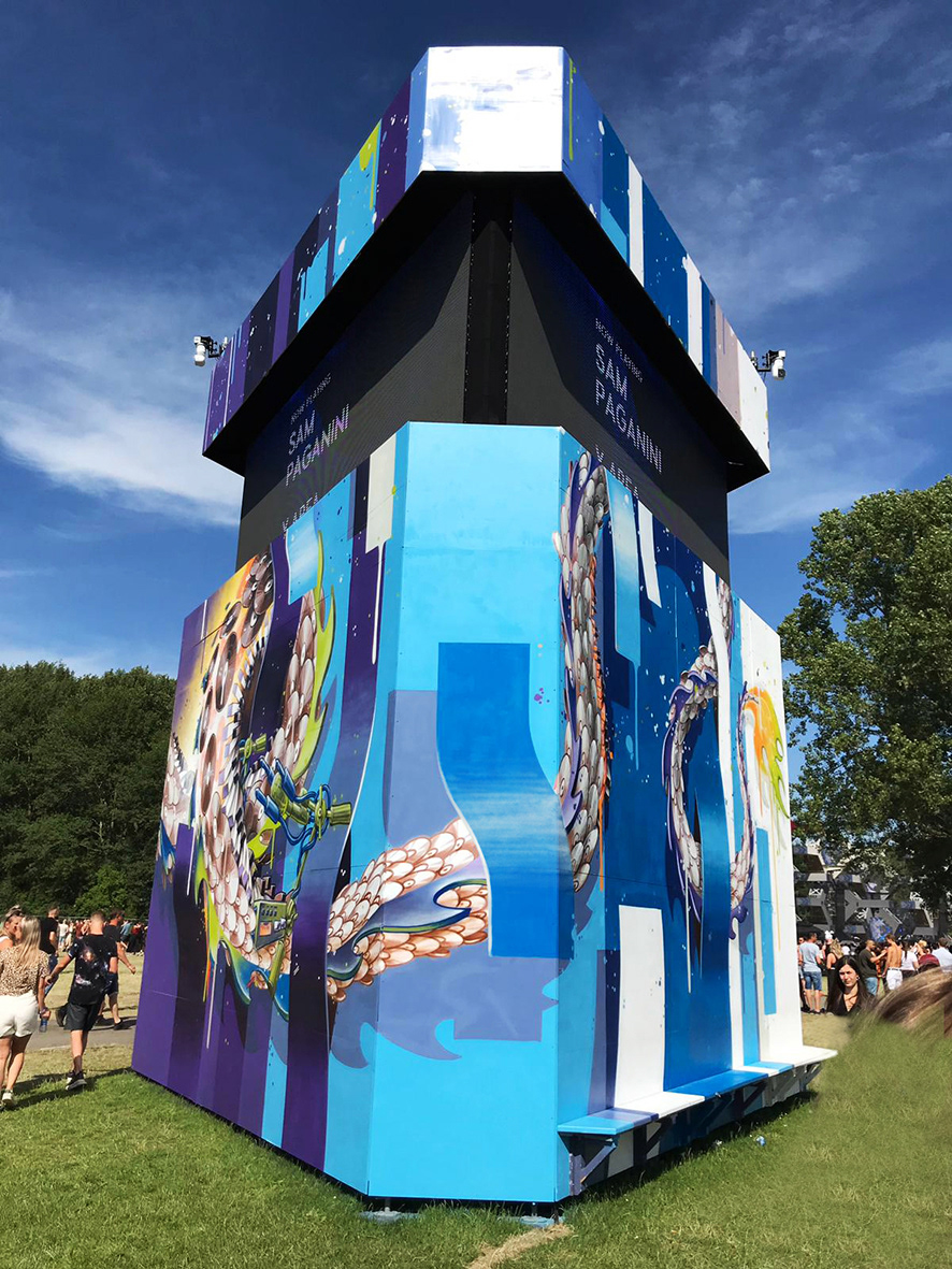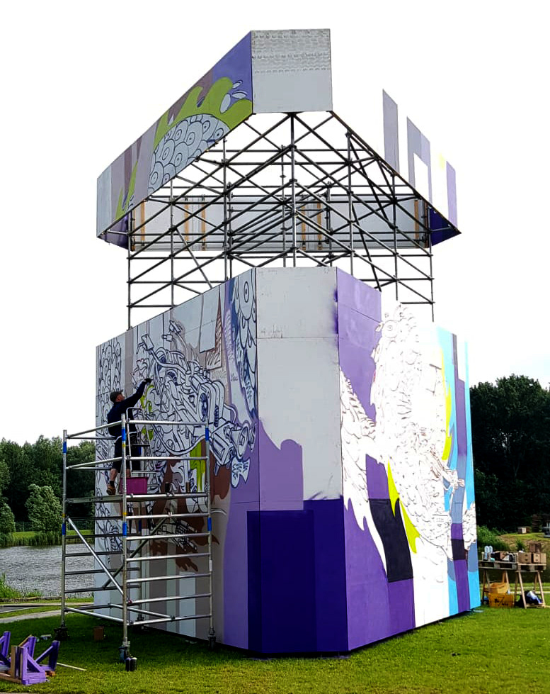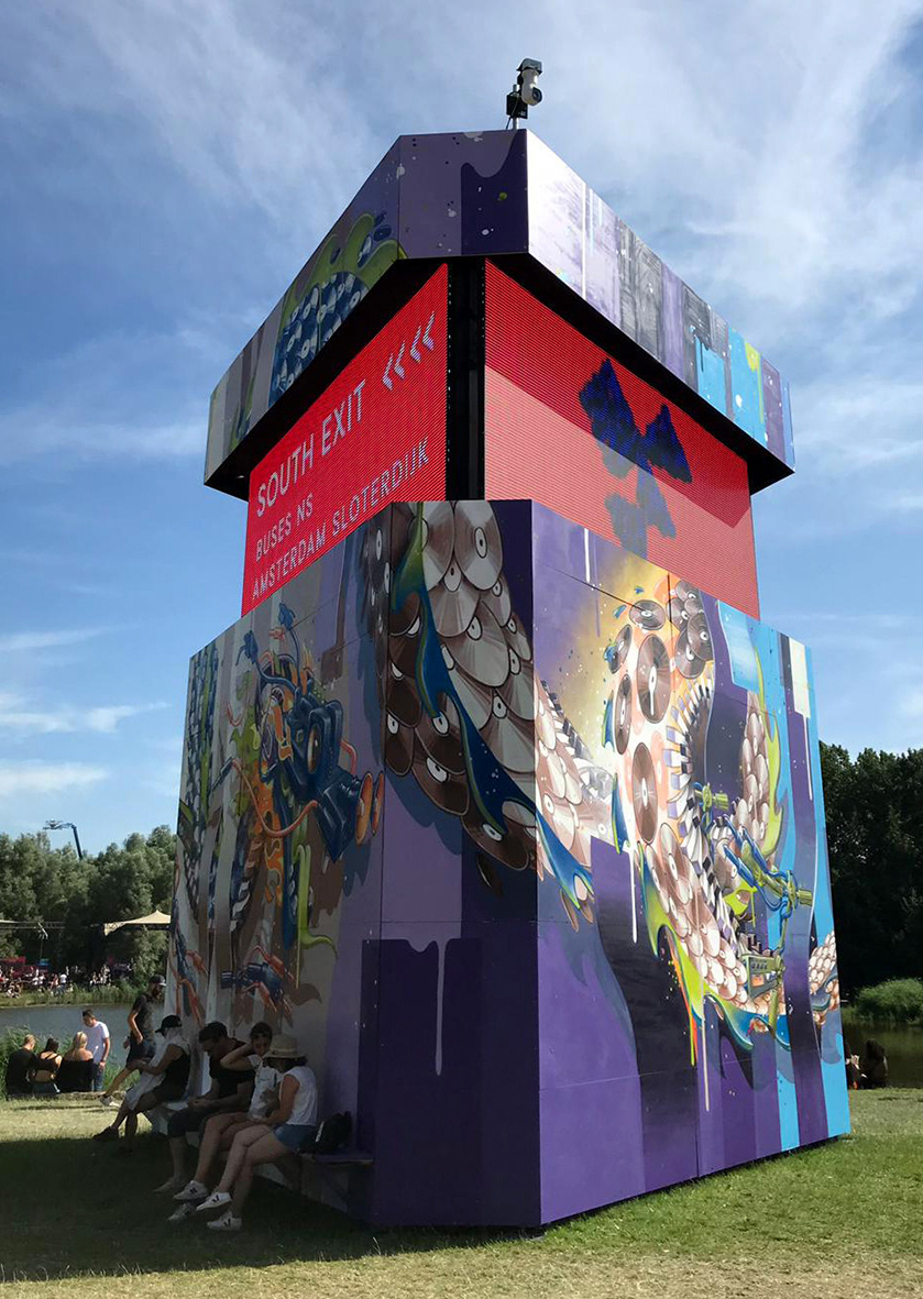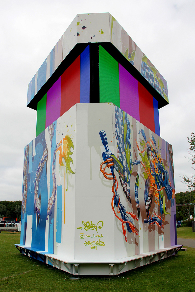 Spray painted wooden triangle tower, AWAKENINGS Festival 2019,