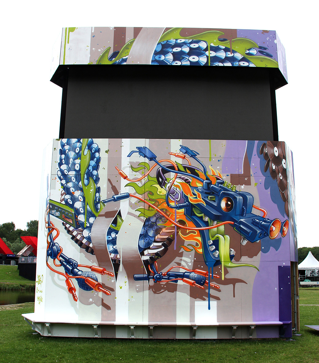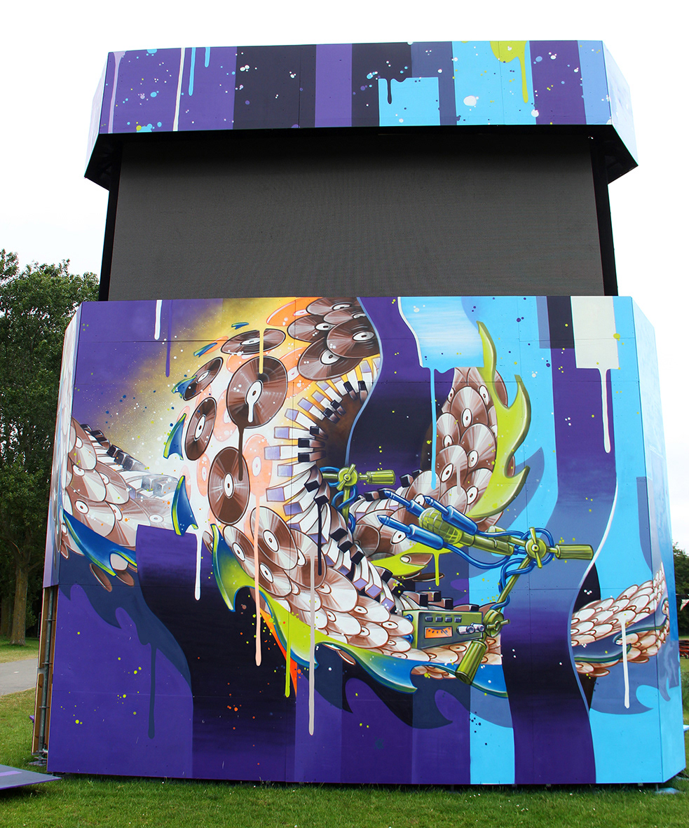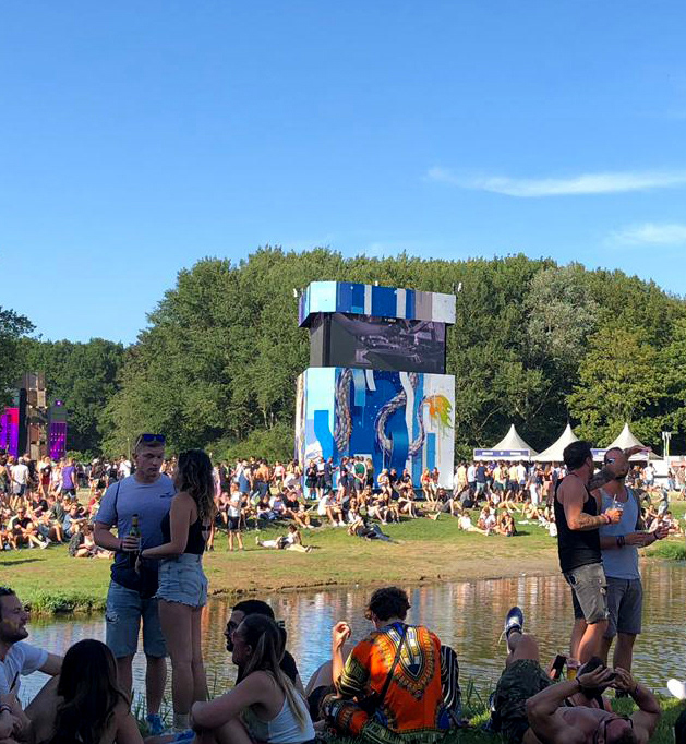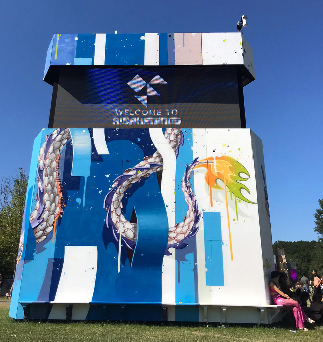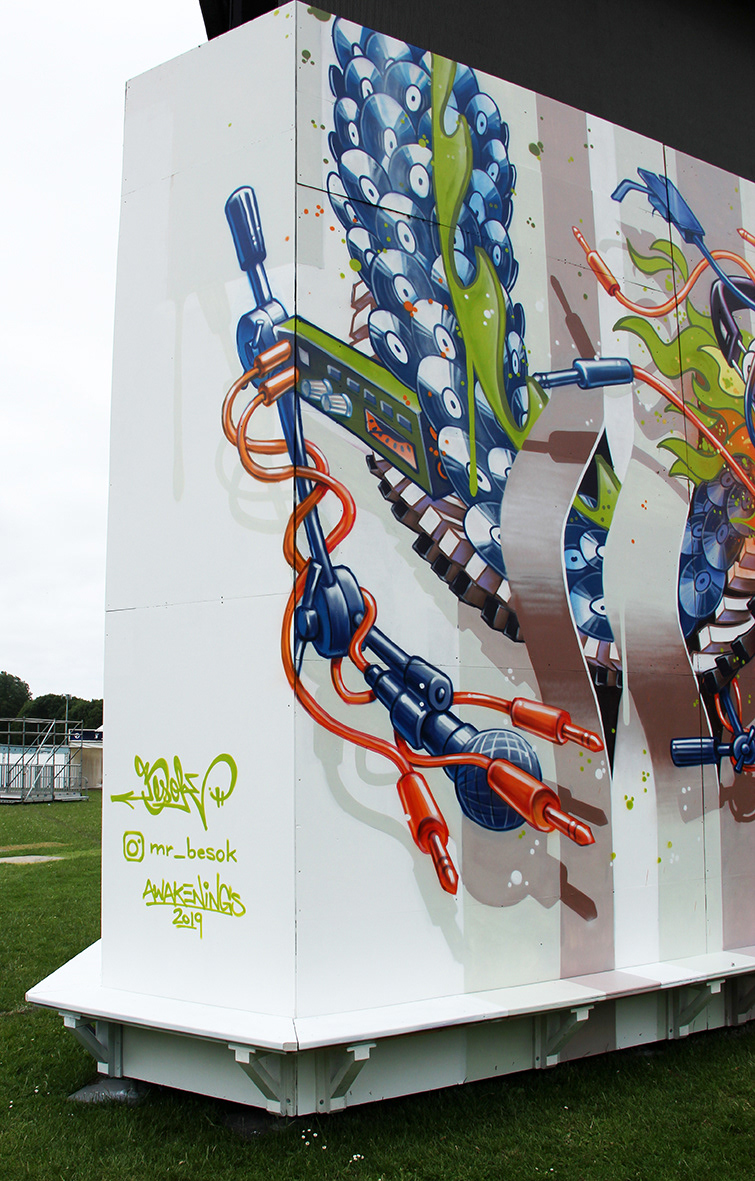 Spray painted wooden triangle tower, AWAKENINGS Festival 2019,